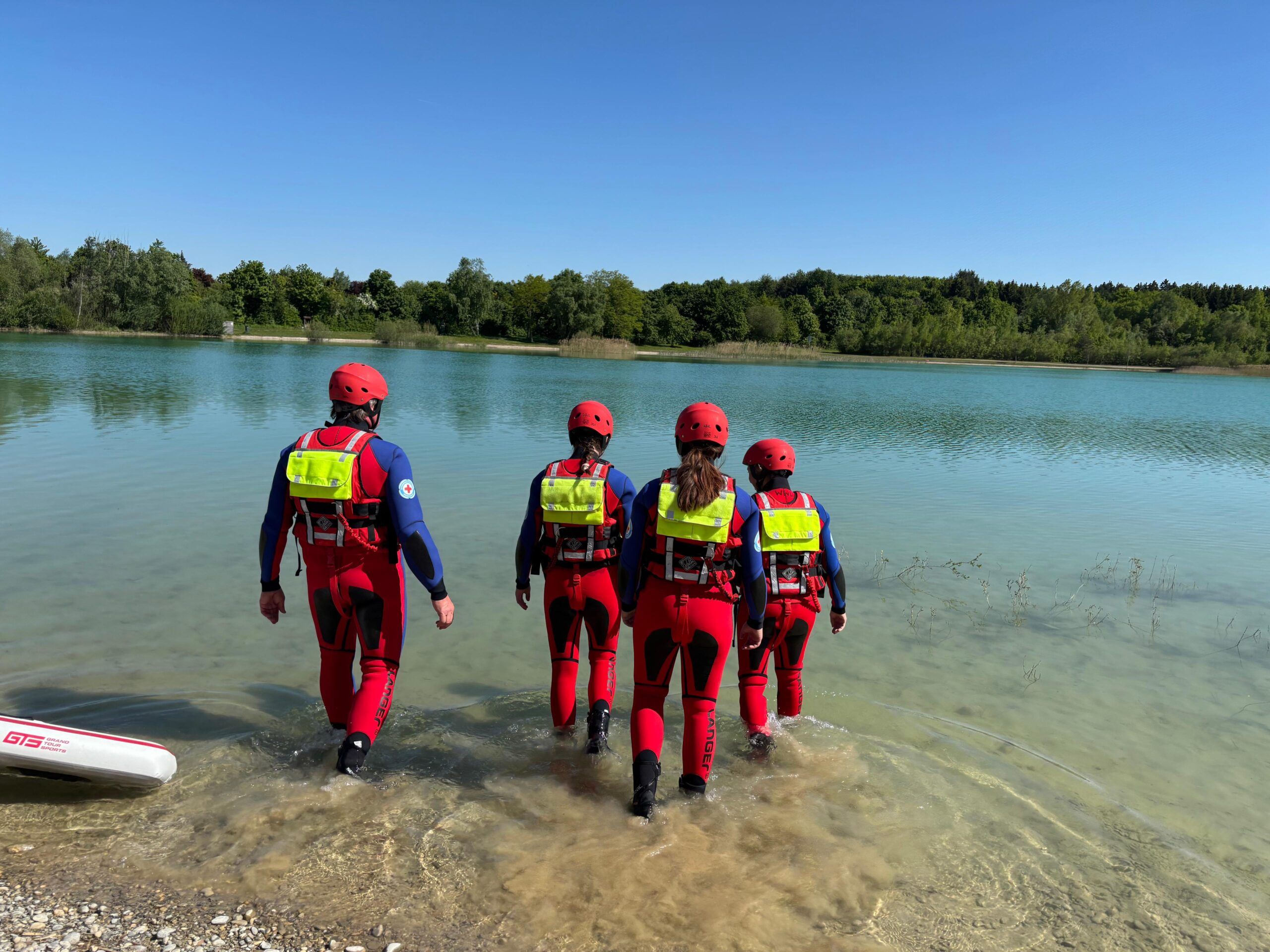 An dem insgesamt zweieinhalb Tage dauernden Lehrgang, ging es mit der Theorie über Einsatzgrundlagen, der Lage-Ersteinschätzung und den Gefahren im Einsatz los. Der Samstagvormittag stand ganz unter dem Thema Reanimation. Es wurde theoretisch der Aufbau und die Funktion von Atmung, Herz-Kreislauf sowie die richtige Technik der Wiederbelebung geschult. An der Reanimationspuppe wurde dann der praktische Umgang mit der Notfallausrüstung und dem AED geübt. Nach einer Stärkung ging es dann am Badesee mit dem richtigen Umgang der Rettungsmittel und verschiedenen Suchtechniken weiter. Der Fokus lag dabei auf der Rettung von Personen aus dem Wasser und deren Erstversorgung an Land. Nach einer weiteren Theorieeinheit am Sonntagvormittag ging es dann an die theoretische und praktische Prüfung. Bei dem Einsatzscenario eines Schwimmers in Not, konnten alle Teilnehmer ihre erworbenen Kenntnisse zur Rettung und anschließenden Wiederbelebung mit AED erfolgreich unter Beweis stellen.