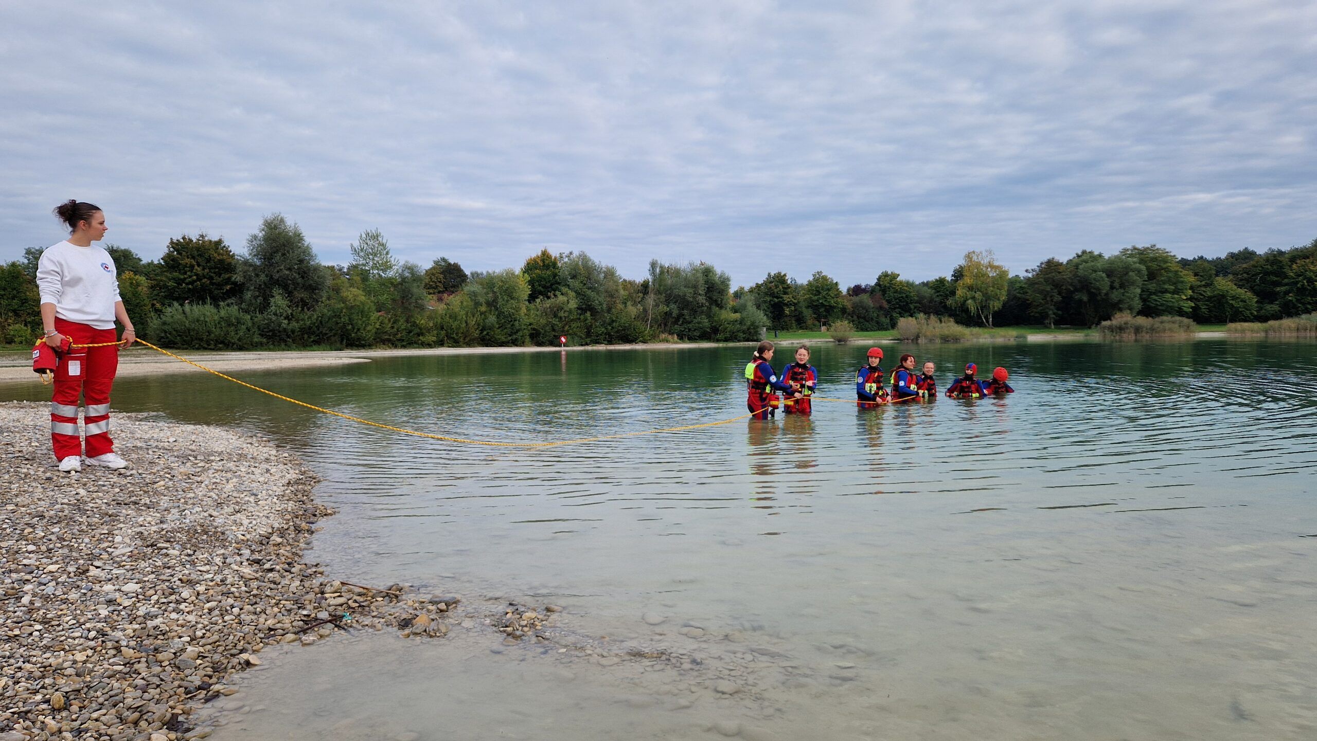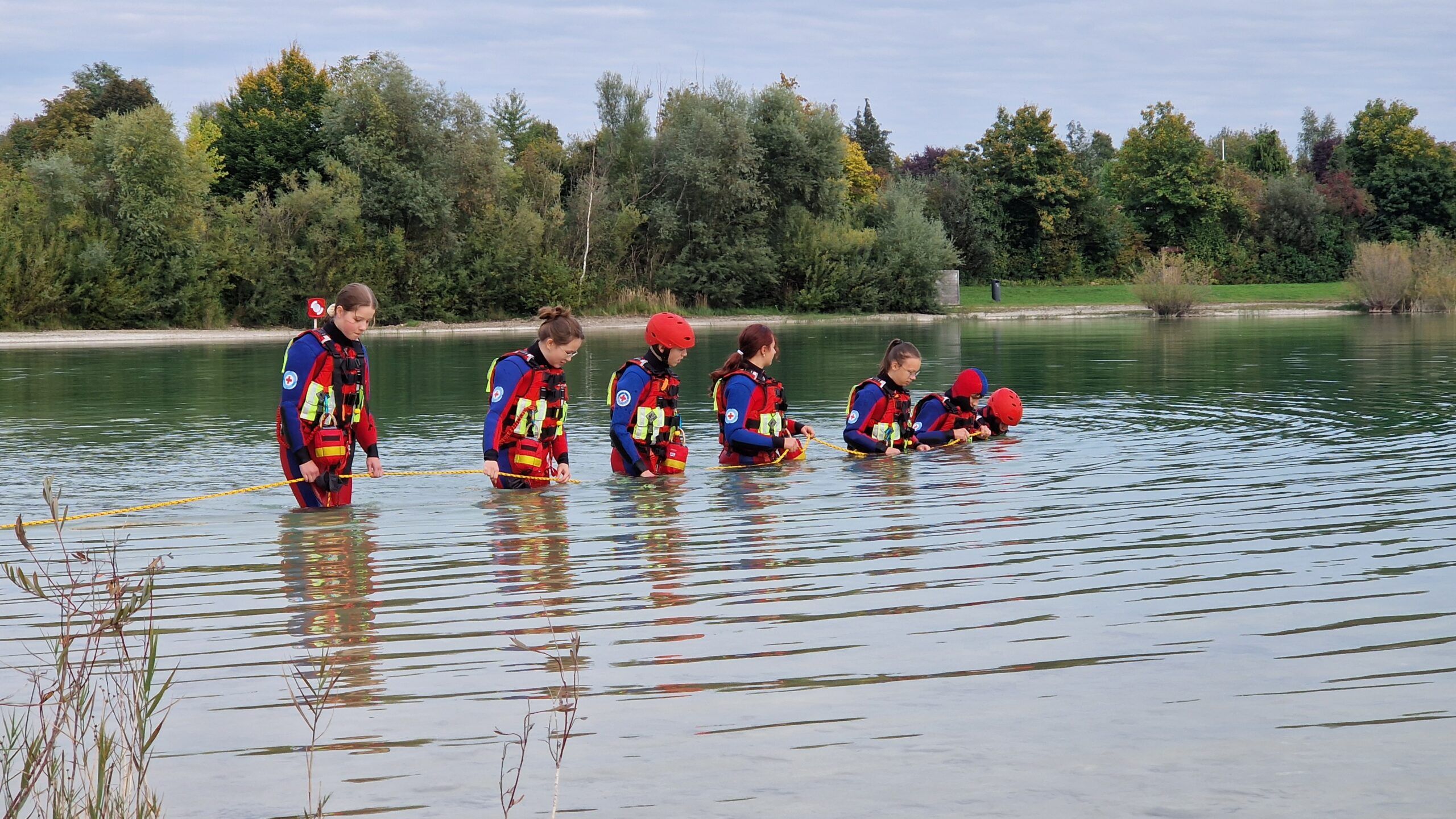 Nach dem Anlegen der PSA nass (Persönliche Schutz-Ausrüstung) und dem gegenseitigen Überprüfen der Ausrüstung ging es mit dem Einsatzszenario los. Auf dem Übungsplan stand die Flachwassersuche nach einer vermissten Person. Dabei wird der Bereich direkt am Ufer bis ins etwa hüfthohe Wasser abgesucht. Um das Gebiet effektiv absuchen zu können wird mittels Wurfsack eine Kette gebildet, sodass kein Bereich übersehen wird. Vom Ufer aus angewiesen konnten die Beiden Übungsgegenstände daher schnell und effektiv gefunden werden.